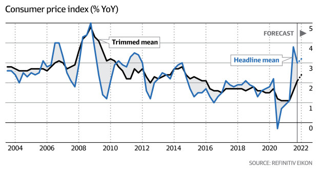 That is above the Reserve Bank’s November forecast of a 2.25 per cent annualised rate and will raise further questions about the central bank’s commitment to maintain its ultra-low cash rate in the face of rising inflation.